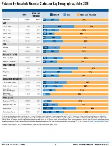 • Veterans living in Census-defined “group quarters”: This includes 2,386 veterans in Idaho living in non-institutional group quarters (such as college dormitories or group homes) and institutional group quarters (such as nursing homes or correctional facilities). Because the cost of living in these settings differs substantially from the cost of living in a household, the ALICE status of these veterans cannot be determined.