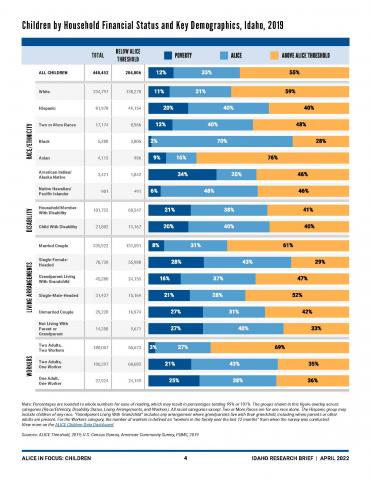 Children below the ALICE Threshold are those under age 18 living in households with income below the basic cost of living for their communities. In 2019, 19% of children below the ALICE Threshold in Idaho were infants (0–2 years), 13% were preschool-age (3–4 years), and 68% were school-age (5–17 years). Children in Idaho’s struggling households are from all demographic groups; they include children born in the U.S. and abroad, of all abilities and races/ethnicities, living with parents or guardians who are married or single, working or not working. Children in households below the ALICE Threshold live in rural, urban, and suburban areas across the state.