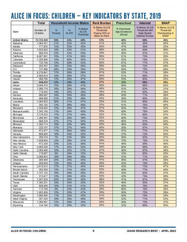 For a variety of reasons, public assistance does not reach all children in households that are struggling. While most children in poverty are eligible, ALICE children live in households that often earn too much to qualify for assistance. For example, the income eligibility threshold in Idaho for one of the most far-reaching public assistance programs, the Supplemental Nutrition Assistance Program (SNAP, formerly food stamps), is 130% of the FPL. Even though all children in poverty should be covered by SNAP, in Idaho the program was utilized by only 48% of children in poverty (26,704) and a mere 21% of children in ALICE households (30,994) in 2019. This left a gap of just over 146,000 children whose families were struggling to make ends meet but not participating in SNAP.