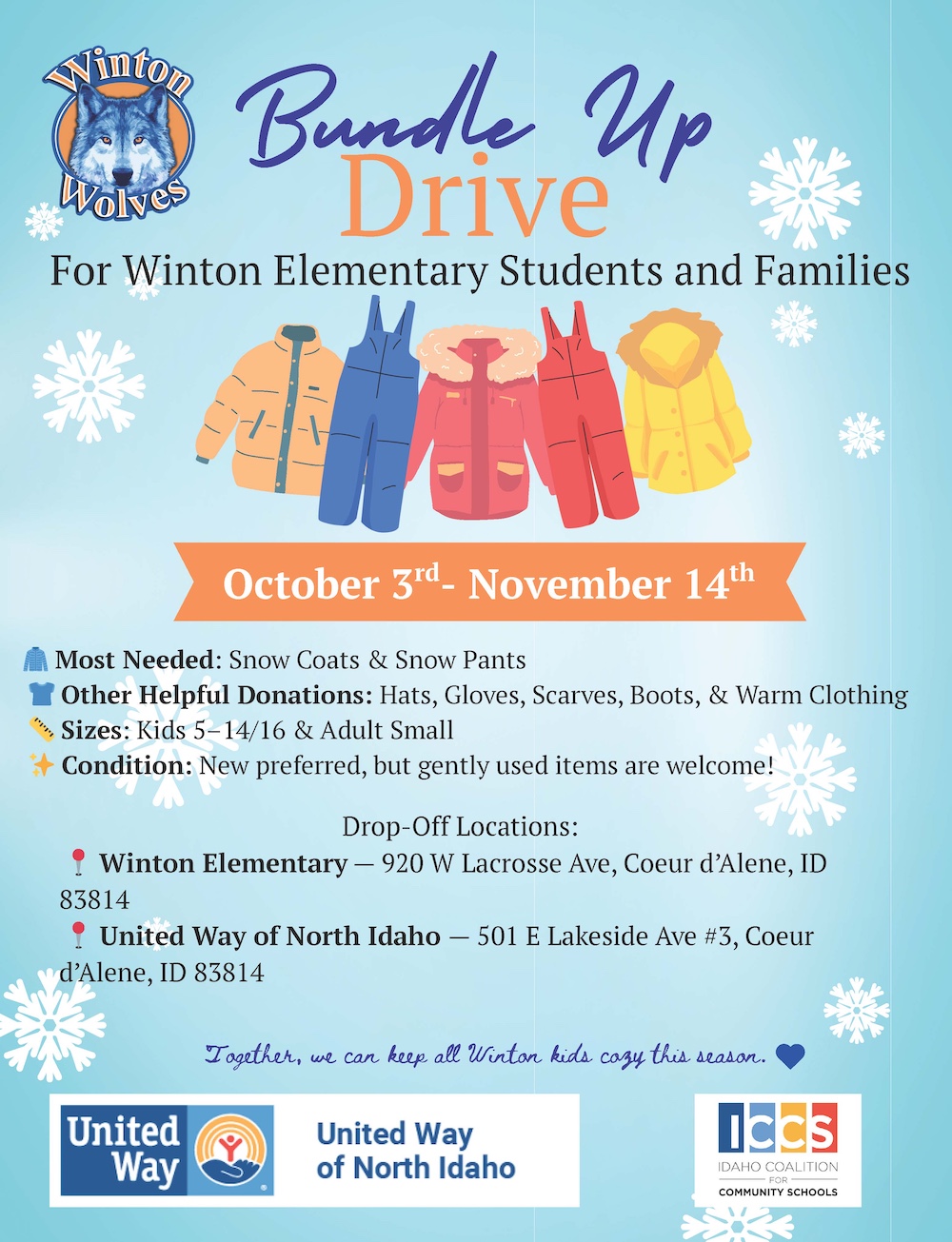 United Way of North Idaho has teamed up with Winton Elementary and the Idaho Coalition for Community Schools to host a Warm Clothing Drive for children in need. Together, we can ensure every child has what they need to stay safe and warm through the cold months.